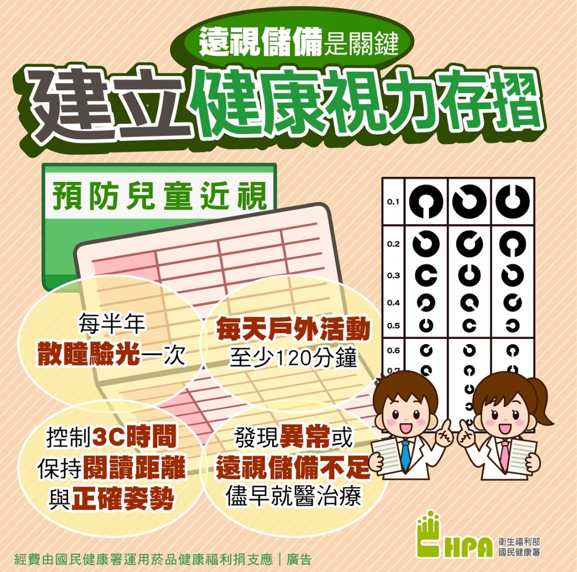 👀為強化兒童視力保健觀念,國民健康署宣導「視力存摺」概念,鼓勵家長從孩子3️⃣歲起,定期進行散瞳驗光,追蹤遠視儲備度數,及早掌握近視風險。
